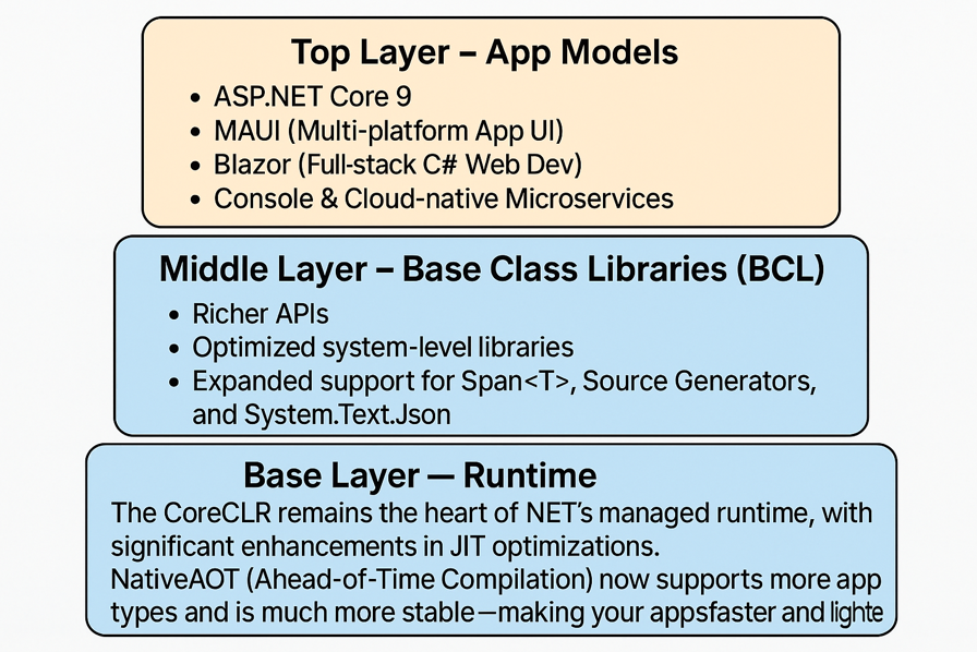 .NET 9 maintains the modern modular architecture of the .NET ecosystem but comes with refinements and improvements.